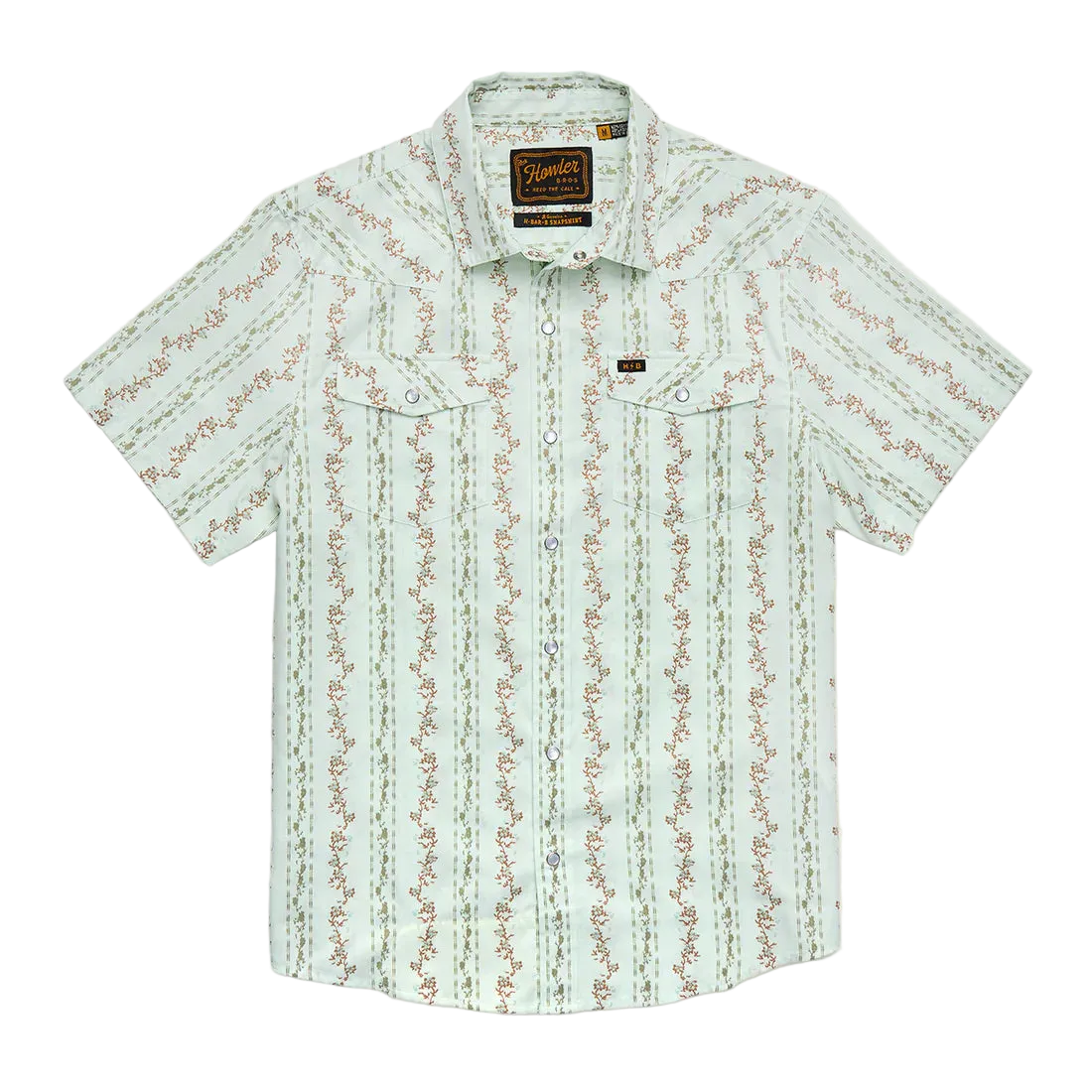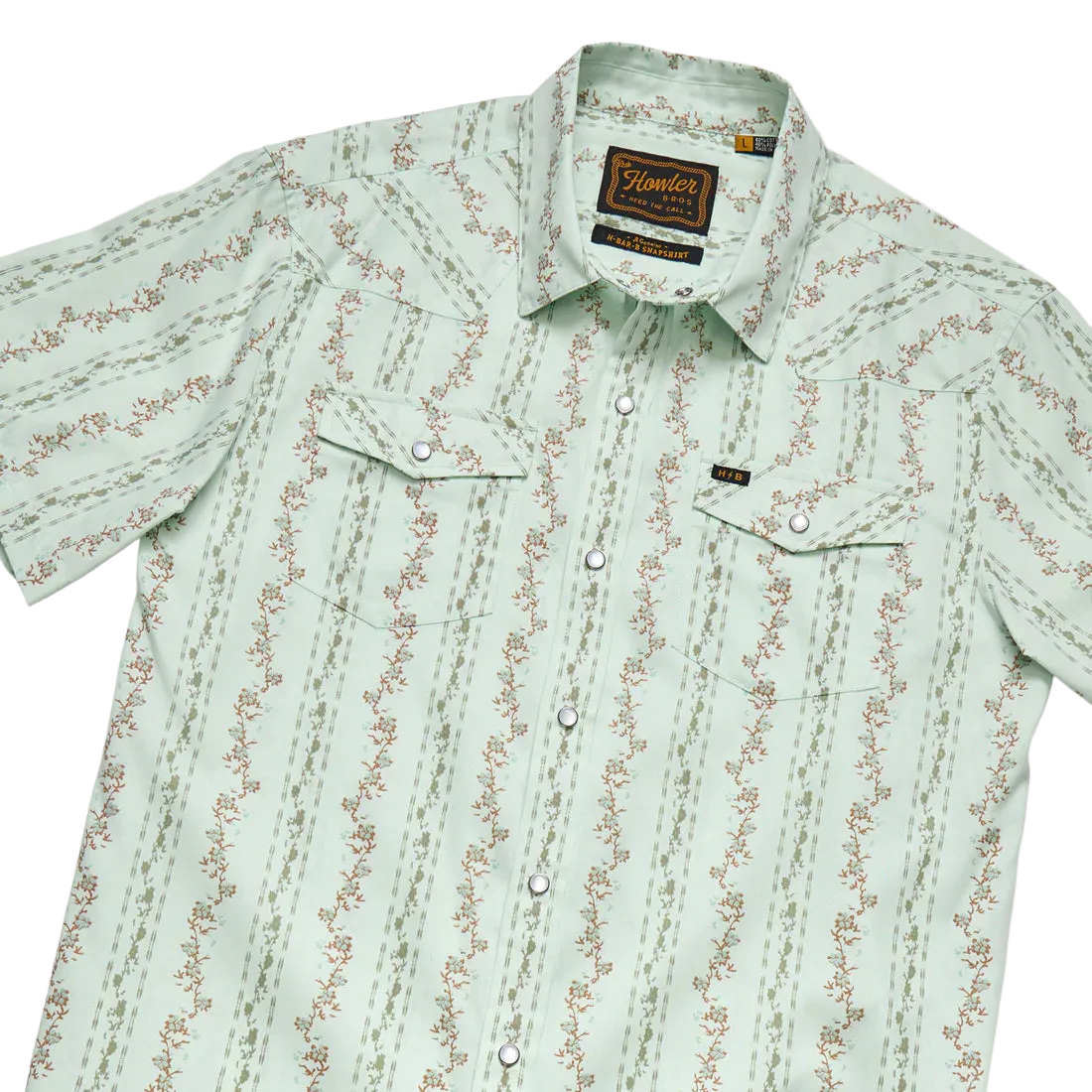 The Howler Brothers H Bar B Snapshirt in Hibiscus Ribbons Mint brings together classic Western lines and an easygoing coastal print. Built with signature pearl snaps and a breathable cotton blend, it’s the short sleeve snap shirt that holds up to long days and still looks sharp at night.